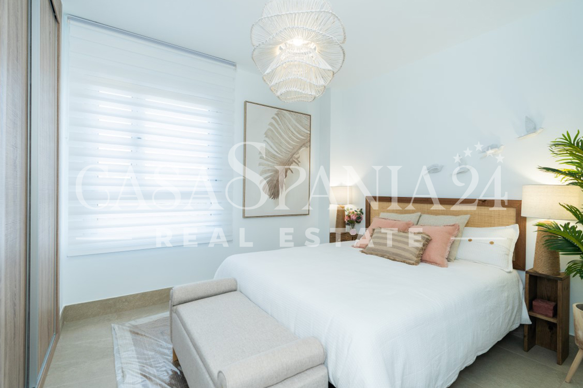 Die Haupteingangstür ist eine Sicherheitstür. Alle Schlafzimmer verfügen über Kleiderschränke mit Melamin-Schiebetüren in der natürlichen Eichenfarbe „Finsa Cambrian Oak Sega“. Die Schlafzimmerfenster verfügen über motorisierte Rollos aus dem gleichen Material und der gleichen Farbe mit Lüftungsschlitzen, um die Raumluftqualität zu gewährleisten.